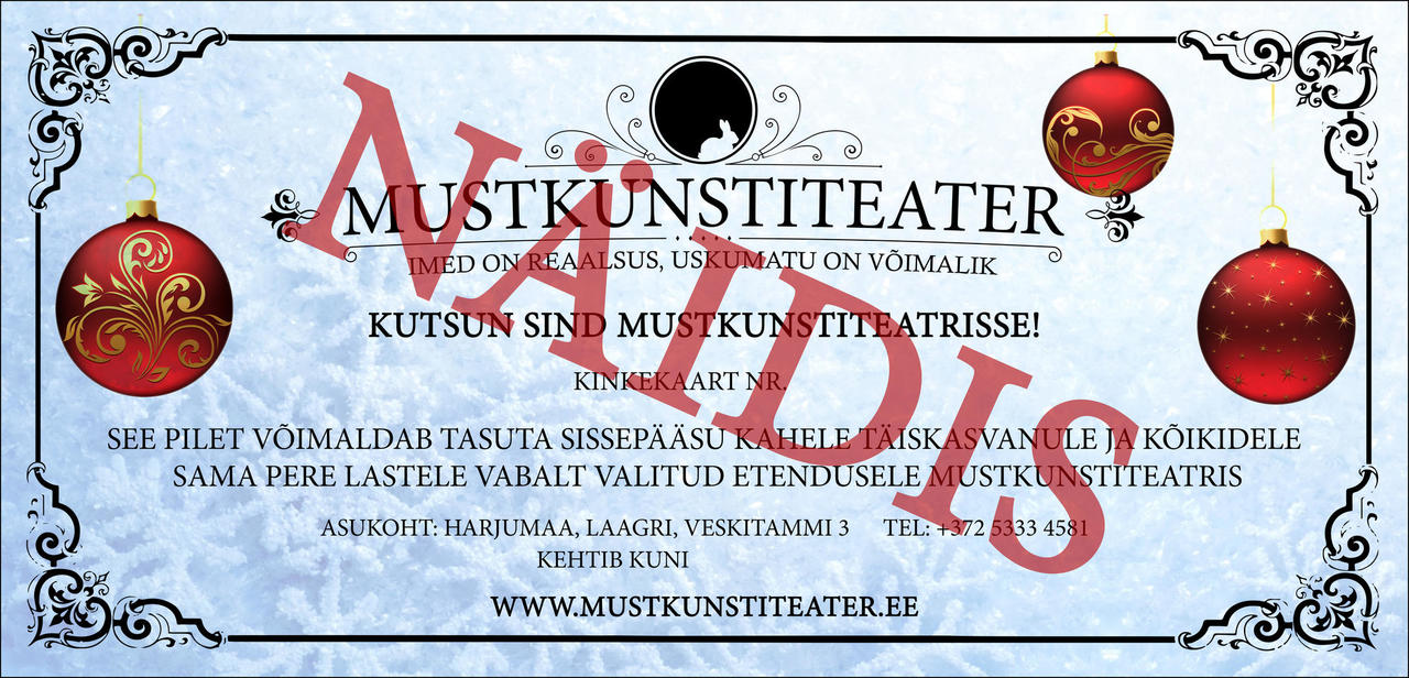 Võimaldab sissepääsu kahele täiskasvanule ja kõikidele sama pere lastele (kuni 18a), vabalt valitud tavaetendusele Mustkunstiteatris 2025 - 2026 aastal.