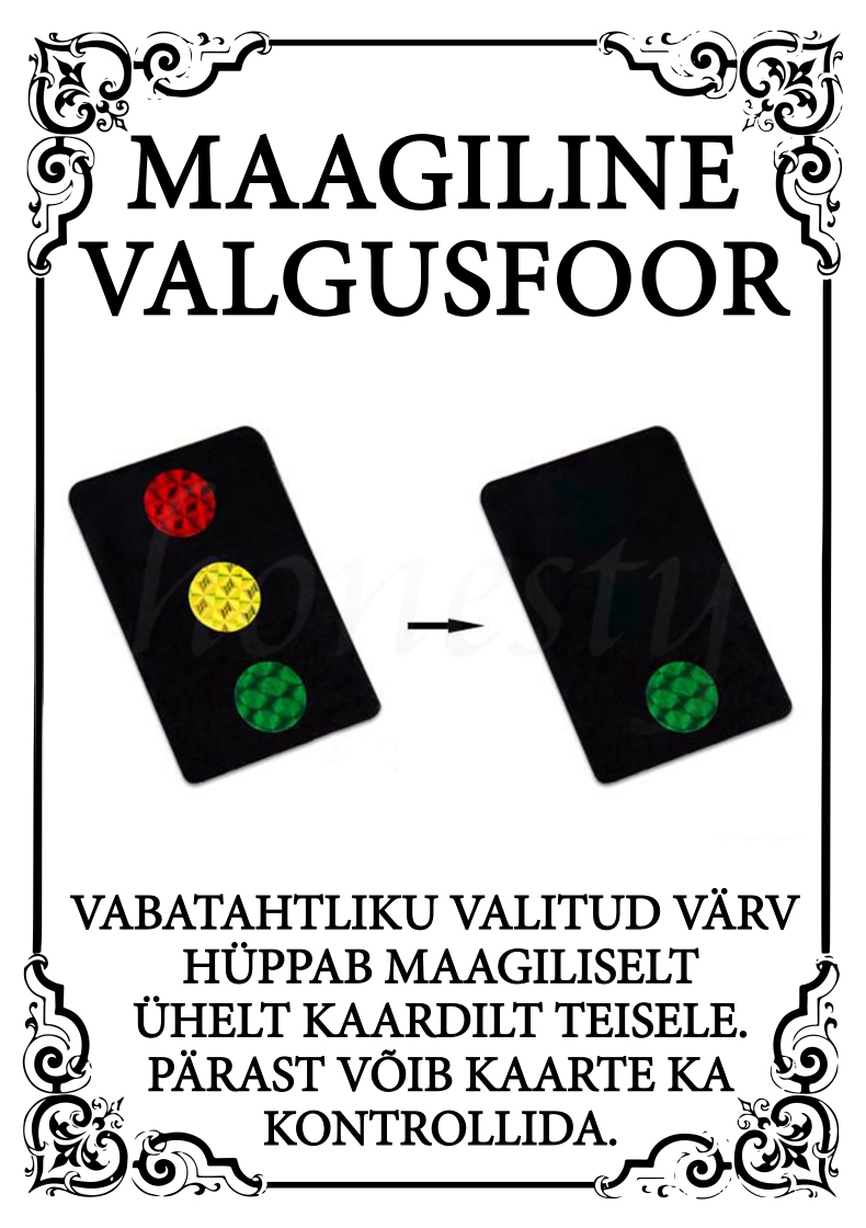 Ühte, millel on kolmevärviline valgusfoor ja teist, mis on tühi. Ta asetab need lauale tagurpidi ja palub vabatahtlikul valida ühe värvi. Võlur teeb kaartide kohal vaid ühe võluliigutuse ja valitud värv ongi foori pealt kadunud ja ilmunud tühjale kaardile.